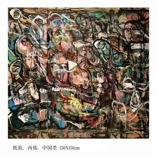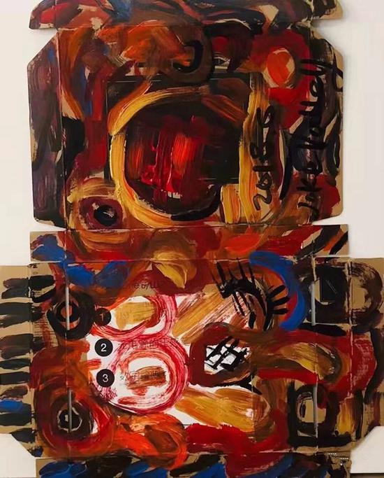 看到艺术家周克吾谷的水墨作品,很可能会颠覆你对“水墨”的固有认知。在整幅抽象作品中,你可能找不到太具体的形象或者符号,反而夺人眼球的是粗壮的黑色线条肆意弥漫,张狂又豪放,一团团浓烈的色块儿在你眼前铺开,燃烧着你的视觉感官,水墨的媒材与丙烯杂糅在一起却相得益彰,粗狂的现成品纸箱取代了传统的宣纸作为了载体,仿佛更加直白的彰显着周克吾谷无处安放的创作激情,看似率性而为之,其实是无数深夜里周克吾谷不间断的艺术实践的成果(前段周克吾谷甚至住进了医院的急救室),观者在冥冥中被这淋漓之至的激情所感染。正如周克吾谷经常说的一句话“美人不同,味道不同;自由狂欢,虽死无憾!”