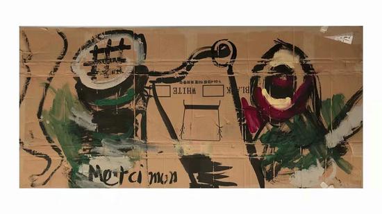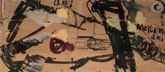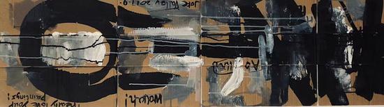 首先源自水墨自身的便利性、随机性和偶发性,使持续的日常创作转换成他个人独特的书写方式。在中国传统艺术修养中,有晨课、日课雷打不动的做法,以保持对笔墨的手感和心得。周克吾谷吃住睡待客皆在工作室,并且喜欢夜间创作,到了几近疯狂的地步:“我必须找到一种方法,马上就能既快速又无拘无束地作画。作品要是能看上去不怎么差,那就让我挺快乐的,有时能快乐一整天。”日记式的坚持、挥霍式的探索,他于大量的涂抹中寻找线条和色块的和谐感、对比度,以及如何有效地凸显承载着他的体温的诉求和观念。最近的创作还借鉴了波洛克的“滴撒”和白发一雄的“撞击”手法,进行摇滚版的“行为水墨”的实验。当个人书写的自觉性替代日常训练的仪式感,身心和笔墨都脱去了来自传统文化和社会生活的无形桎铐,获得了哲学意义上的解放和自由,进而迸发出更多的可能性——这在他返回西安后创作的一批作品中得到了体现。其次是对材质随心所欲的选择:这批展品的载体,已经不是传统的纸张,而是使用后废弃的棕色包装箱箱皮;在水墨之外,他也大量的杂以油彩和丙烯。“非要把我用过的杂物放置在画面里,寻找一种美妙的快感……这是没有做过的人无法体验到的。”对于创作工具和材质的扬弃、选择,不仅仅是一个技术手段,更是语言和目的:“运用一些破坏的技法,来开始另一种绘画形式的尝试。”这批包装箱材质的展品,粗野而又生猛的达到了形式和内容的统一,并且时时揭示着日常生活的痕迹甚至背后的创口。
